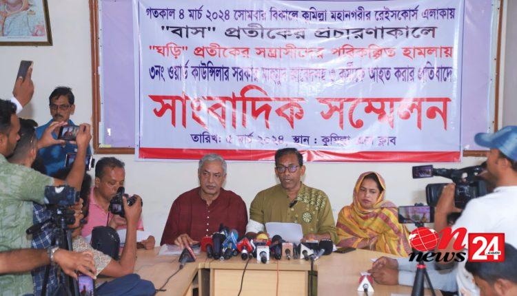 কুসিক উপনির্বাচনে কুমিল্লা মহানগরীর ৩নং ওয়ার্ডের রেইসকোর্স এলাকায় ‘বাস’ প্রতীকের প্রচারণাকালে ঘড়ি প্রতীকের কর্মীদের পরিকল্পিত সন্ত্রাসী হামলা ও ‘বাস’ প্রতীকের ৩ কর্মীকে আহত করার প্রতিবাদে সাংবাদিক সম্মেলন করেছেন স্থানীয় কাউন্সিলর সরকার মাহমুদ জাভেদ।