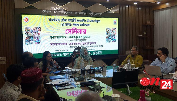 কুড়িগ্রাম প্রান্তিক জনগোষ্ঠীর জীবন মান উন্নয়ন প্রকল্পের(২য় ফেজ) অবহিতকরণ সেমিনার অনুষ্ঠিত হয়েছে।জেলার বিভিন্ন দপ্তরের পেশা ও শ্রমজীবি মানুষ ও সাংবাদিকগণ উপস্থিত ছিলেন।মঙ্গলবার ২৮ মে দুপুরে কুড়িগ্রাম জেলা প্রশাসক কার্যালয়ে এ আলোচনা সভা অনুষ্ঠিত হয়েছে।এসময় প্রধান অতিথি হিসেবে উপস্থিত ছিলেন কুড়িগ্রাম জেলা প্রশাসক নুসরাত সুলতানা।এছাড়া উপস্থিত ছিলেন রংপুর সমাজসেবা অধিদপ্তরের পরিচালক মোছাঃ জিলুফা সুলতানা,কুড়িগ্রাম জেলা সমাজ সেবা কার্যালয়ের উপ পরিচালক মুহাঃ হুমায়ূন কবির, সমাজ সেবা অধিদপ্তরের সহকারী পরিচালক মোঃ কামরুল হাসান,সদর সমাজ সেবা কর্মকর্তা মোঃ হাবিবুর রহমান, সাংবাদিক অধ্যাপক শফিকুল ইসলাম বেবু, শাহীন আহমেদ, সাইয়েদ আহমেদ বাবু, ফজলুল করিম ফারাজী, সমাজসেবা অধিদপ্তরের কর্মকর্তা মনিরুজ্জামান,মোঃ শফিকুল ইসলাম ও মোঃ আবু সুফিয়ান সহ অনান্যরা।লোকজ যন্ত্র কারিগর সুমন চন্দ্র বলেন,আমরা লোকজন যন্ত্র তৈরি ও সংস্কারে অর্থের অভাবে আধুনিকায়নের ব্যবস্থা করতে পারছি না বলে ক্ষতিগ্রস্ত হচ্ছি।আশাকরি সমাজ সেবা পাশে থাকলে পেশাটিকে ধরে রাখাসহ আমাদের জীবন মান উন্নয়নে ব্যাপক সহযোগিতা পাবো বলে জানান তিনি।সাংবাদিক সাইয়েদ আহমেদ বাবু বলেন,জেলার সাড়ে চারশো চরাঞ্চলের মানুষের জিবন মান উন্নয়নে বতর্মান জেলা প্রশাসক নুুসরাত সুলতানা যে ঐকান্তিক প্রচেষ্টা চালিয়ে যাচ্ছেন তা প্রসংশনীয়। চরের যুব নারীদের নকশীকাঁথা ও শতরঞ্জিতে অন্তর্ভুক্ত করে আত্মকর্মসংস্থানের সুযোগ তৈরি করতে সমাজসেবা অধিদপ্তরের দৃষ্টি কামনা করেন তিনি।সেমিনারে সমাজসেবা অধিদপ্তরে আওতায় প্রান্তিক জনগোষ্ঠীর জীবন মান উন্নয়নে বেকার ও শ্রমজীবি নারী পুরুষের জন্য ১০ টি সফট স্কীল ট্রেডে প্রশিক্ষনের ব্যবস্থা, আর্থিক সহযোগিতা প্রদান ও প্রকল্প বাস্তবায়নে জনমত ও পদক্ষেপ গ্রহন করা হয়।বক্তব্যে রংপুর সমাজসেবা অধিদপ্তরের পরিচালক মোছাঃ জিলুফা সুলতানা বলেন,রংপুর বিভাগ বিশেষ করে কুড়িগ্রাম ও গাইবান্ধা জেলা মানুষের জীবন মান উন্নয়নে প্রান্তিক জনগোষ্ঠীর কর্মসংস্থান,শিক্ষা ও কারিগরি সহায়তা প্রদান কাজ করে যাচ্ছি। আমাদের এ কার্যক্রম অব্যহত থাকবে।কুড়িগ্রাম জেলা প্রশাসক নুসরাত সুলতানা বলেন,কুড়িগ্রাম জেলা সব দিক থেকে পিছিয়ে রয়েছে।জেলার মানুষের জীবন মান উন্নয়নে অনান্য জেলার মত প্লান না করে কুড়িগ্রামে চর ও সমতলে আলাদা আলাদা বাজেট করে তা বাস্তবায়ন করলে জেলাবাসীর জীবন মানের উন্নয়ন ঘটবে বলে জানান তিনি।